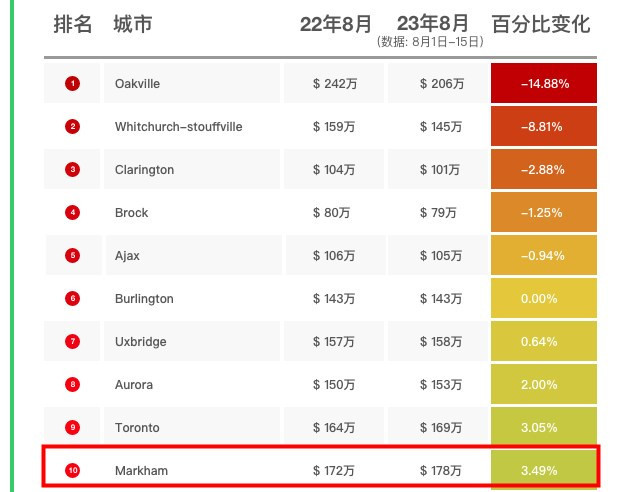 51找房统计数据显示,8月上半月独立屋平均价下跌的市镇有5个,其中独立屋跌幅超10%的只有1个,那就是Oakville。Oakville、Whitchurch-Stouffville和Clarington位居跌幅榜前三名。