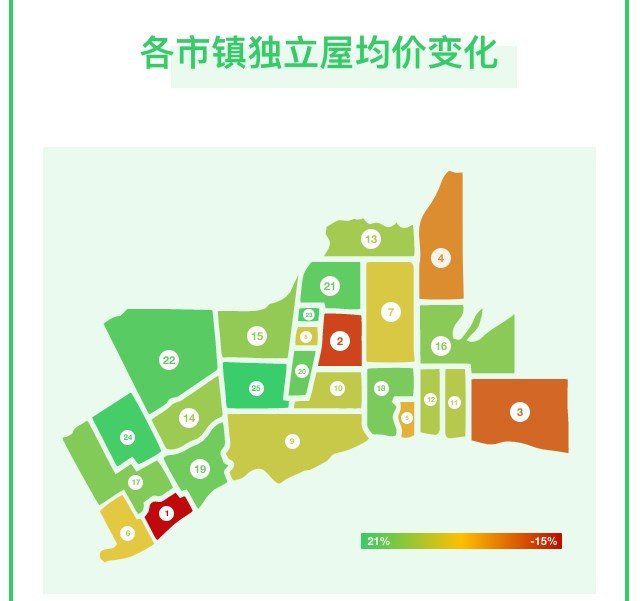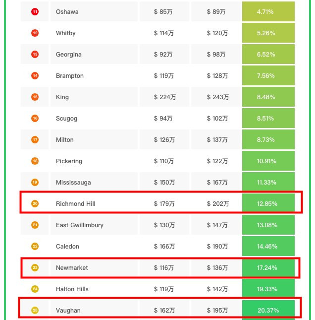 大多伦多地区独立屋涨跌幅排名 图源:51找房