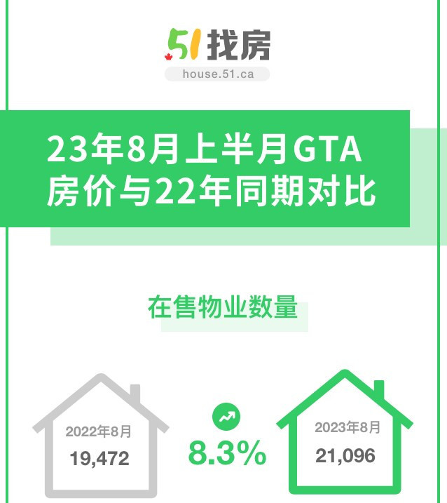根据51找房统计数据,大多伦多地区房屋挂牌数量同比上涨,8月上半月挂牌数量达21096套,比去年同期增加8.3%。
